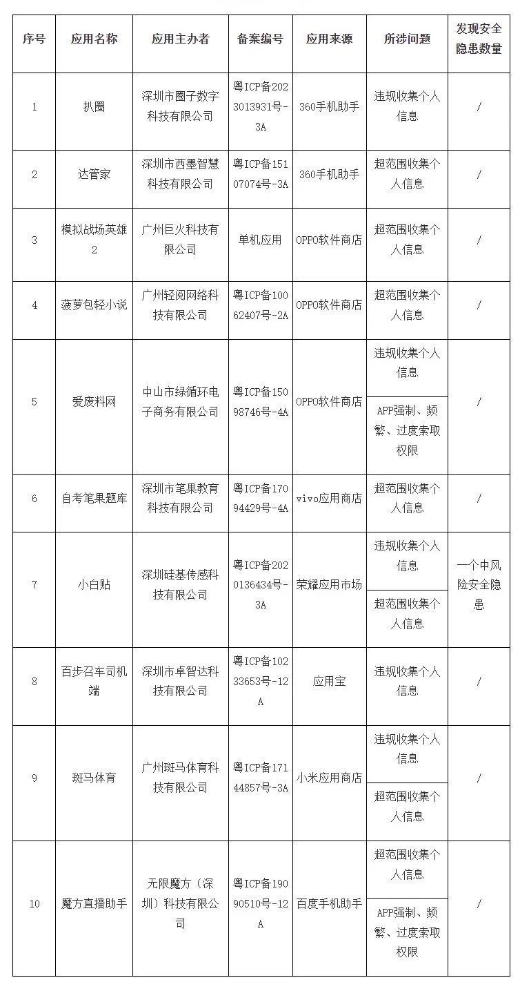 依据《中华东说念主民共和国个东说念主信息保护法》《中华东说念主民共和国集聚安全法》等法律礼貌,按照工业和信息化部《对于进一步升迁迁移互联网专揽劳动本领的见知》(工信部信管函〔2023〕26号)等责任部署,广东省通讯握住局合手续开展APP隐秘合规和数据安全专项整治手脚,发出《违警非法APP惩处见知》责令APP运营者限期整改,并见知关联专揽商店协助督促APP运营者整改。杀青现在,尚有10款APP未完成整改(详见附件),现给以通报。