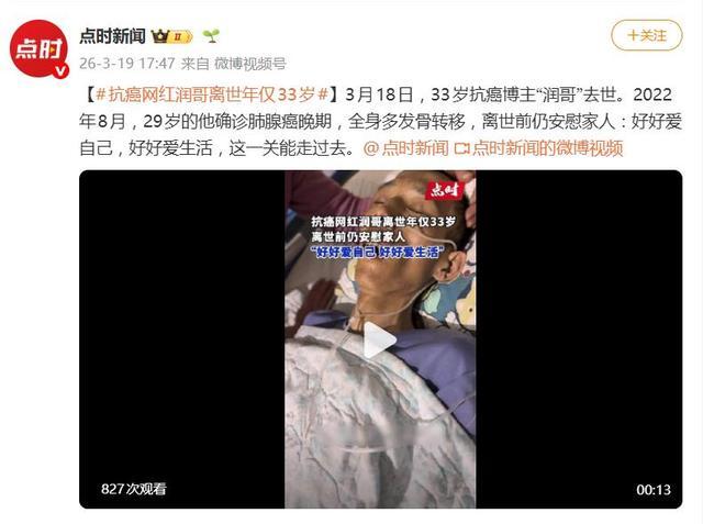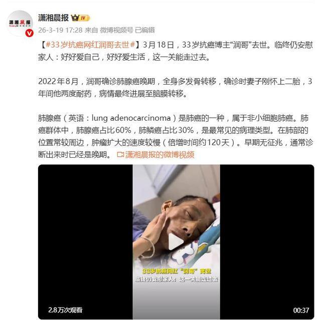 据3月19日报谈,3月18日,一个名为“润哥”的抗癌博主生命定格在了33岁。他临终前强忍剧痛抚慰家东谈主的那句话——“好好爱我方,好好爱生活,这一关能走以前”——连忙传遍收罗九游体育app官网,让大宗网友蓦的破防。这句留给嫡亲的仁和嘱托,成了他与这个寰球临了的告别。
