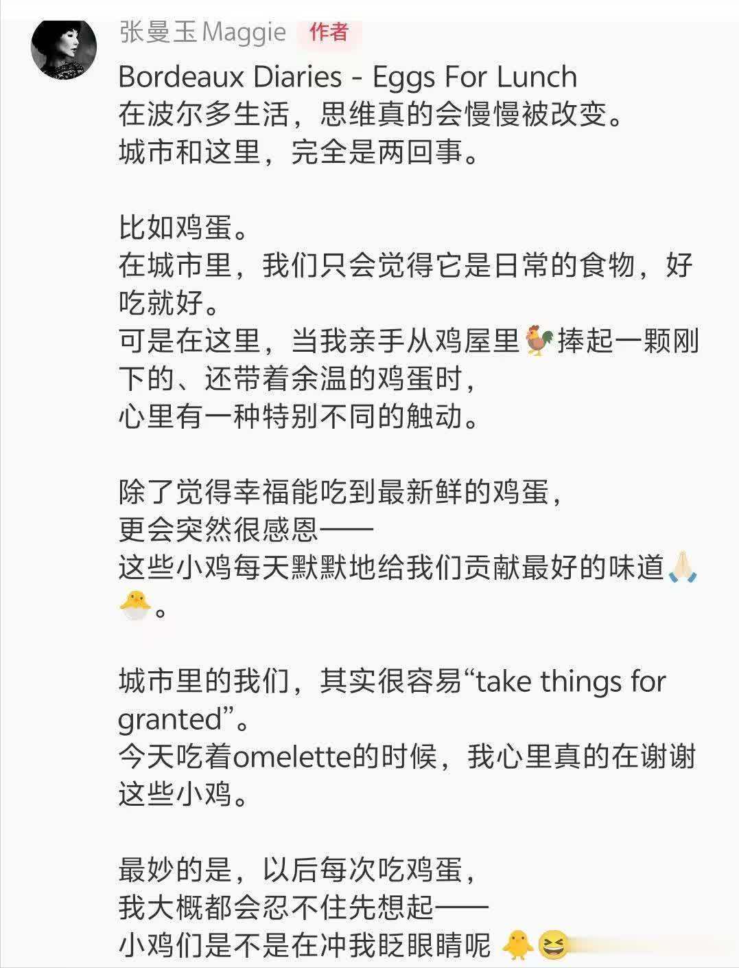 除了认为能吃到最簇新的鸡蛋,张曼玉还十分感德,称这小鸡每天缄默地给咱们孝顺最好的滋味。