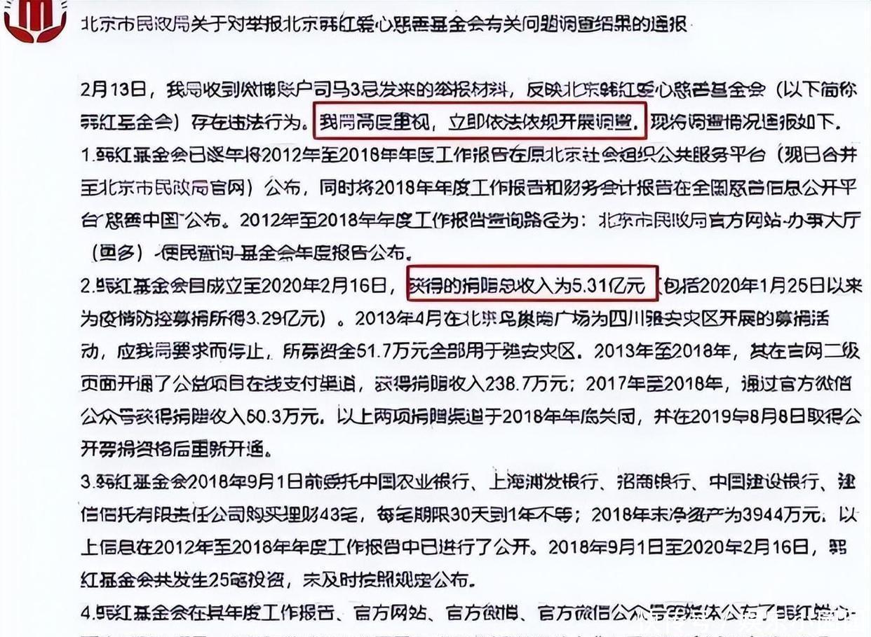 2020年2月20日,官方通报出炉:韩红爱心慈善基金会自树立以来总收入5.31亿元,其中疫情时代3.29亿善款,每一笔去处赫然,操作合规。