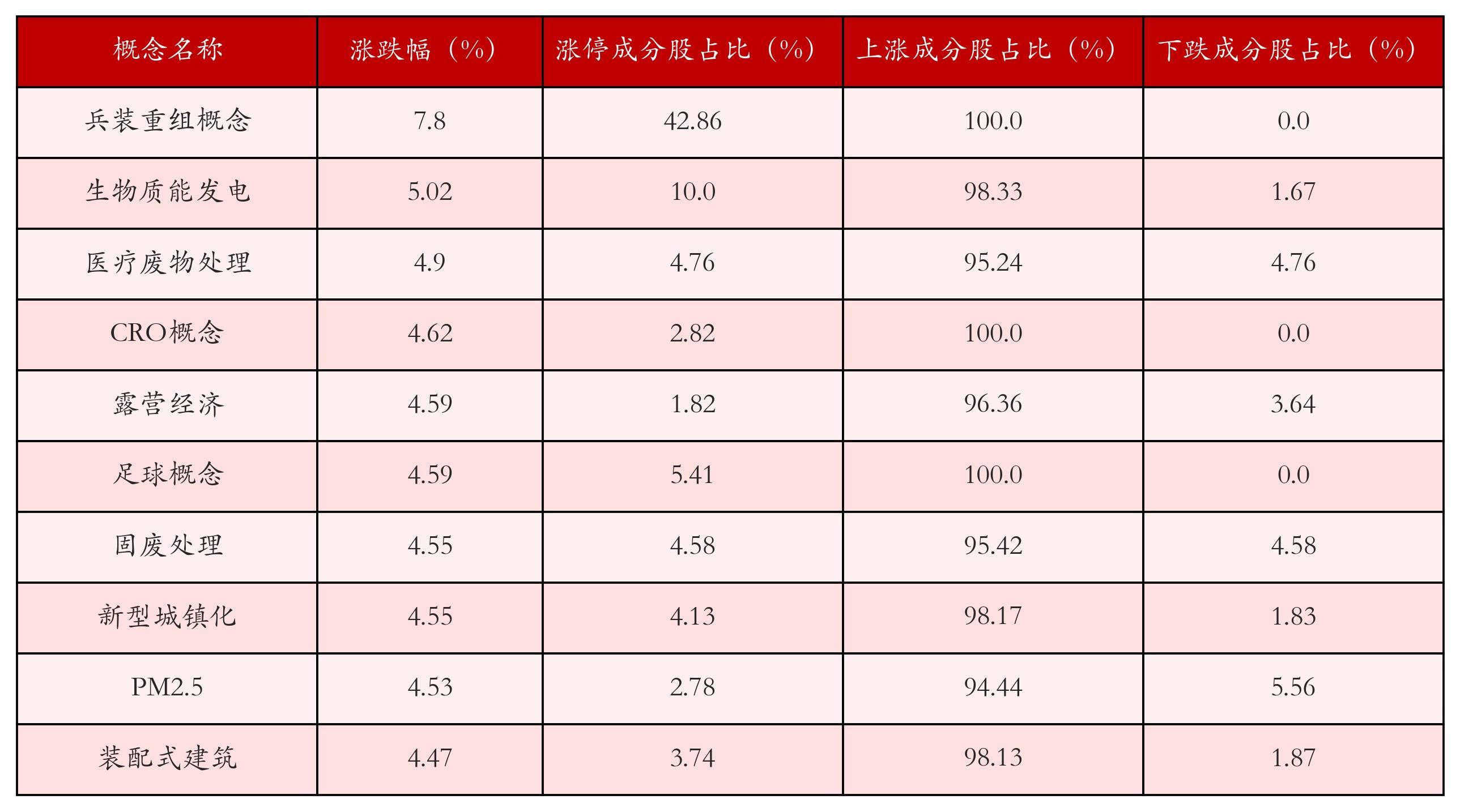 字据A股观念涨跌幅与所对应的股票池概括分析,涨幅靠前的三个观念板块折柳为:兵装重组观念、生物资能发电与医疗废料处分。名次前10位的观念板块干总共据见下表: